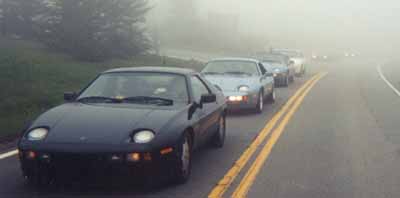 Grey! slow, mmmbrblmmmbrblmmm... what's this?! ...something bouncing in the light, opposite lane... FROG! crazy frog... stop, frog, please stop frog, I don't want to smush you but I'm not gonna risk skidding my wife's car to protect your slimy arse... hop hop he's at the yellow lines, I'm almost on him... stay there froggy, don't move... hop damn. I can just imagine him caught up by the 928's brake duct, hanging on to the vanes for dear life, eyes squeezed shut against the wind, on an adventure that makes Toad's Wild Ride look like browsing at a Buick showroom, if only he could just hang on for a bit longer... In the morning, there was no sign of the frog. ...grey! lowbeams! braaaaaaaaake DEER!!! MORE BRAKE! MORE BRAKE! EVASIVE ACTION! (excuse me, but do you hear something that sounds like a frog laughing?) One thing that's always impressed me about these cars is how stable they are, even in bad weather. I caught up to Noah and passed him, grateful that I could, at least, be reasonably certain that Hannibal would not be attempting to cross the Appalachians this weekend, so I had no need to fear grey elephants hiding in the grey fog. The morning came, if you could call it that, since no one had bothered to clean up the grey as yet. We caravanned a short drive to Beech Mountain, where the SCCA was hosting a hillclimb. They opened the road once an hour and we were late, so we blocked off the top of the mountain with three dozen 928s for about 20 minutes. Hey, if you gotta sit in traffic, might as well be because of a school of Sharks. When we were finally allowed down, we were met with cheers and waves all the way! These people were surrounded by all manner of interesting racecars, and they were waving and cheering for us. Maybe I'm a little slow, but it wasn't until that moment that I realized that this "scene", if you will, is something special... even by enthusiast standards. You just don't see that many 928s, not in ten years, never mind dozens of them parading through a tiny town in the Appalachians. The 928 is an important marker in the history of sports cars, and enthusiasts respond to it. We're preserving our culture here, a small piece of the answer to why there are car guys. Speaking of car guys: "Why is it," Kara started with That Tone, "that everybody here assumes it's your Porsche?" "Um," I cleverly replied. "Um, as far as I can tell you're the only girl 928 owner here." She rolled her eyes. "It's still a man's world."