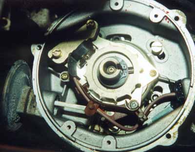 Once you've got enough space to work on the distributor, the cap has to come off. That means something will have to be done about the wires -- either unplug them at the spark plugs (and possibly end up having to move the A/C compressor) or unplug them at the cap (keeping track of where they go). You should only have to unplug half of them (the rear six plugs); just move the cap forward once the rears are removed. The cap also has two vent hoses connected to it; one on the top and one on the side pointing toward the rear-left.You'll need to unplug them as well. The cap is held in place with three flathead screws. Loosen them (they need not be removed) and pull the cap. Lo, the internal workings of the Lucas distributor. Now is a good time to check it for damage. Inspect the cap and rotor for cracks, burns, and gouges. Check the centrifugal advance's operation. This is done by manually turning the rotor counterclockwise. It should move 11 degrees CCW. It should move freely without hesitation (although it is spring loaded so you may feel a little spring tension) and it should snap back to position as soon as you let go, with authority and a metal clink. If it does not move, or moves sluggishly, or doesn't snap back, your centrifugal advance is shot. A common failure; don't feel bad about it. Luckily ours passed the test. If yours does not, consult Experience In A Book by Kirby Palm for guidance. In fact, if you're not in a hurry, you might want to rebuild the thing anyway. Testing done, it's time to proceed. The rotor pulls off. It pulls off carefully. Do not yank it. Gently wiggle it loose. You do not want to damage the shaft it mounts on.