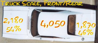 Several friends suggested we use a truck scale by putting one axle on at a time, so we gave that a try. We found a local trucking company with a racer-friendly owner who leaves the scales on all night. According to his scales, the Charger weighs 3,850 lbs. -- 50 lbs. more than it weighed three years ago during the Spacebears Racing Weight Test. Actually, it's even more than that; in 1999 we weighed with the driver in the car, and this time we thought we weighed with the driver out of the car (although it's possible that the railing we were standing on was also part of the scale). Assuming we did not, in fact, add the driver to the numbers, then the Charger picked up some 250 pounds over three years ago! We don't have a reasonable explanation for this, other than one of the scales must be off by quite a bit. But the weirdness doesn't stop there. We tried the one-axle method suggested by our friends, and came up with 2,180 lbs. for the front and 1,870 lbs. for the rear. Which all looks great until you add them up and get 4,050 lbs. -- 200 more than the car's overall weight! And there's that number 200 again. Something fishy is definitely going on here. If we ignore the overall numbers and just look at the relationship between the numbers, then we get a startlingly favorable 54/46 front/rear weight distribution. If this proves true, then the car won't need nearly as much front-end dieting as we originally thought. We might even be able to get by without fiberglass. To check these numbers, we're going back to the truck scales for a closer look. Then, we hope to find a racer kind enough to loan us his pro scales. Finally, we have some intriguing plans for a DIY weight distribution scale using a bathroom scale and some lumber. Check back soon!
