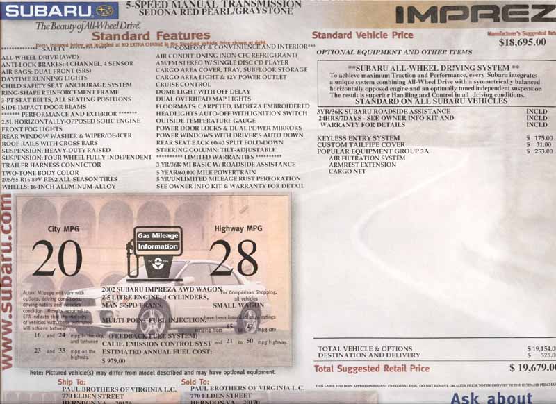 Contrast this to our local dealership, John Howard Subaru, where they expected us to pay full MSRP, tried to bury the actual rollover of our trade in fuzzy math, and included a few mandatory fees such as "dealer ad group" (we're supposed to pay for their ads?) $150; dealer "services" (oh you'll get serviced all right...) $600; paint sealant $200; fabric protectant $80; and pin stripes for $50! All told it would have cost us an extra $2,500 to buy our car from John Howard. The time and gas money spent going to Virginia was repaid many times over by the friendliness and honesty at Paul Brothers.